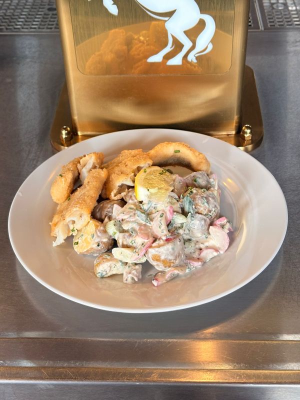2. Smažená kuřecí kapsa plněná sýrem, zeleným pepřem a šunkou, šťouchané brambory149 Kč