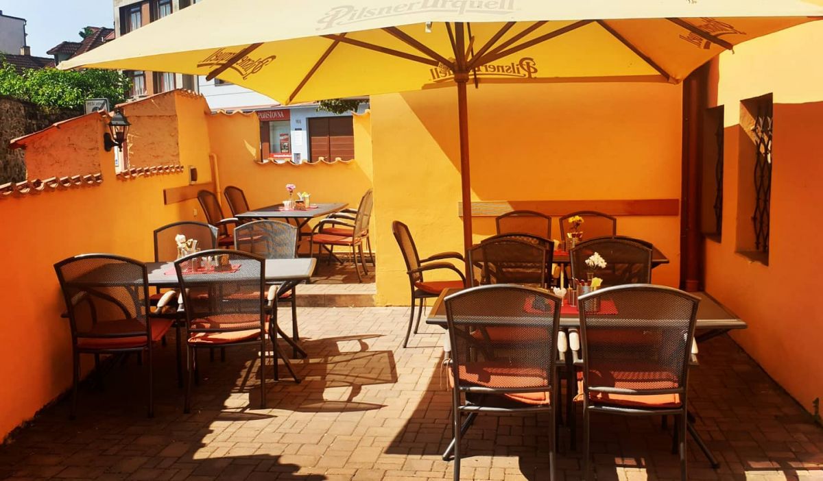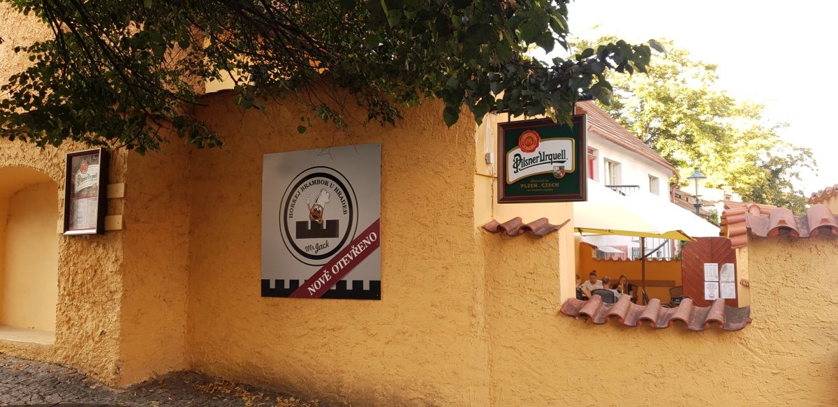 • 1. 120g Hovězí guláš, naše bramboráčky, červená cibulka