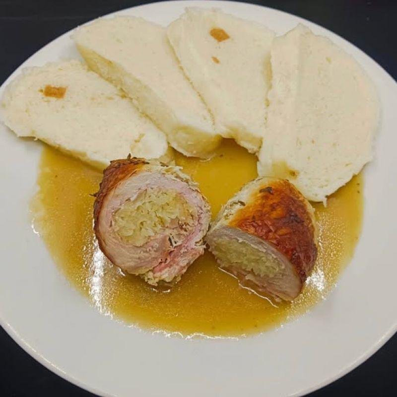 2. 150g Pečená vepřová krkovice, dušený špenát, variace knedlíků145 Kč