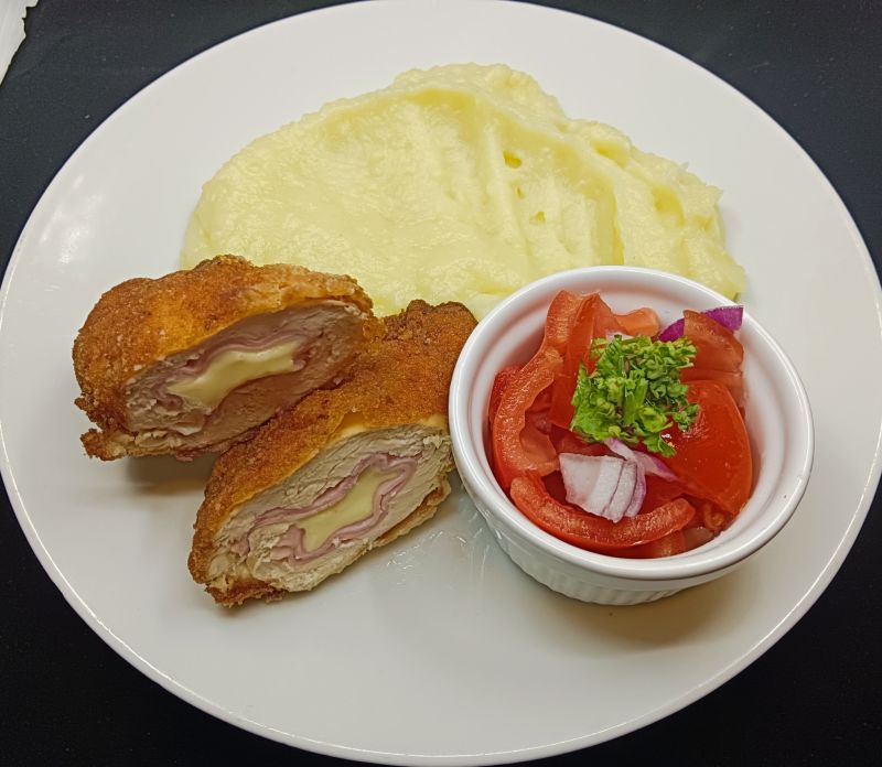 1. 150g Kuřecí plátek s mozzarellou a rajčetem, hranolky, bbq149 Kč