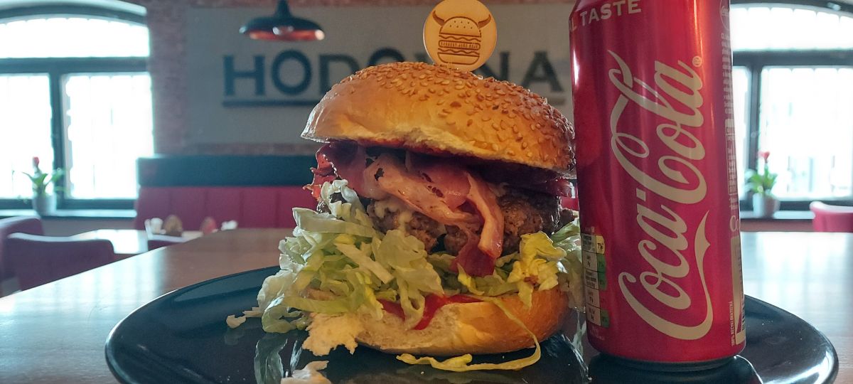- BURGER JAKO BEJK obří bulka se salátem, rajčetem, okurkou, červenou cibulí, burgerem (200g), BBQ omáčkou, sýrem cheddar a křupavou anglickou slaninou, hranolky, salát coleslaw244 Kč