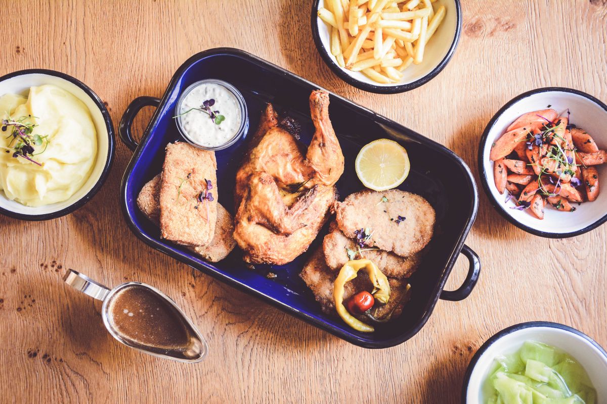 3. Smažený kuřecí řízek s bramborovou kaší a malým okurkovým salátem154 Kč