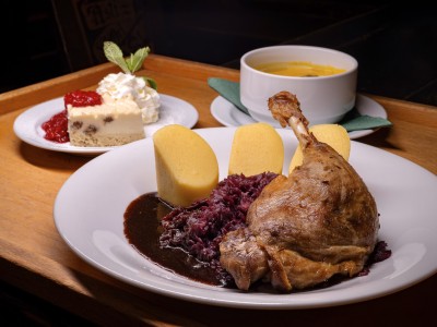 • 1. Smažený hovězí karbanátek, bramborová kaše, kyselá okurka