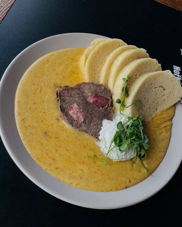 • 1. 150g Hovězí guláš, houskový knedlík 1a, 3, 7, 9