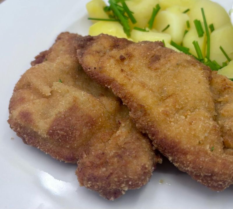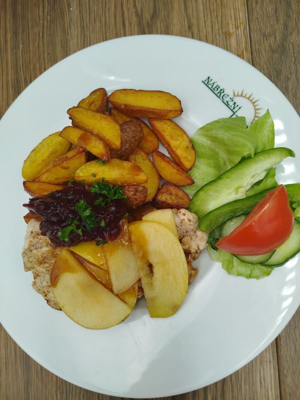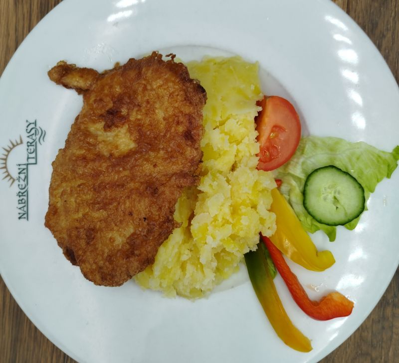 1. 150g Vepřový řízek naruby se šťouchaným bramborem135 Kč