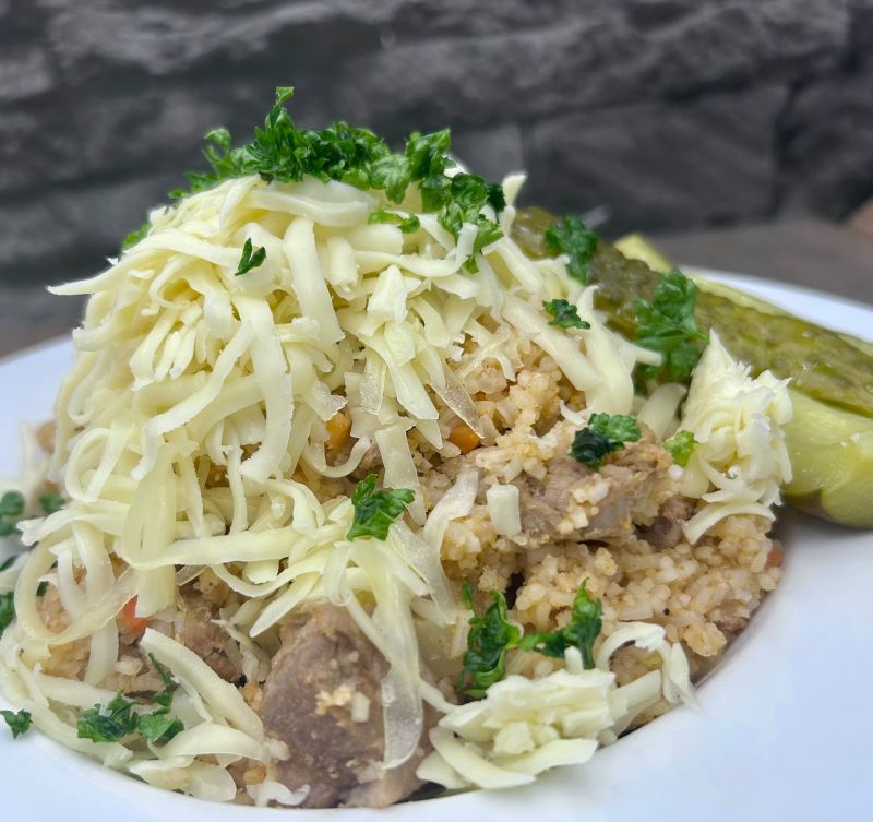 3. 150g Hrachová kaše se smaž. cibulkou, uzeným masem a chléb125 Kč