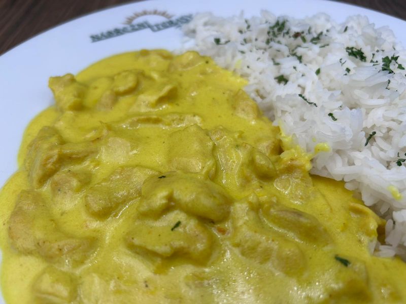 • 2. 150g Kuřecí steak s rýží a třešňovým kompotem