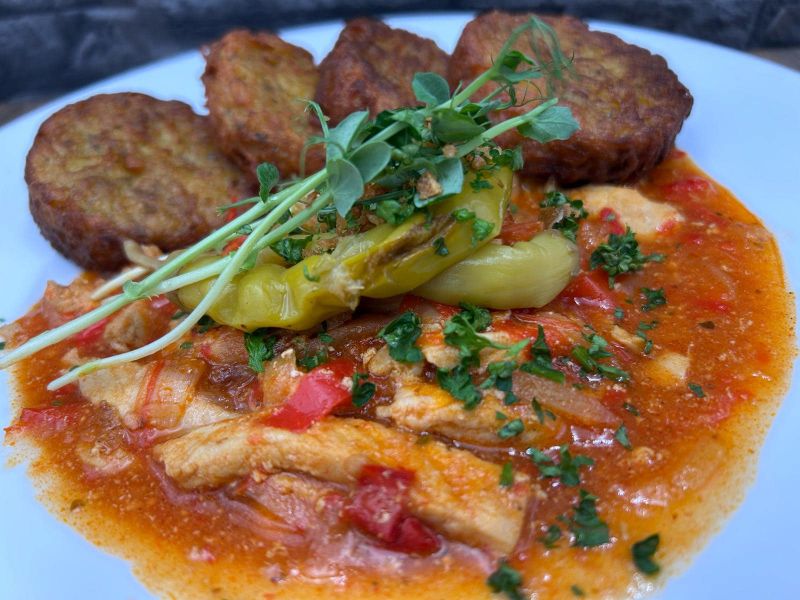 2. 200g Vepřová panenka s omáčkou z Irské whisky se zeleninovou oblohou, bagetka168 Kč