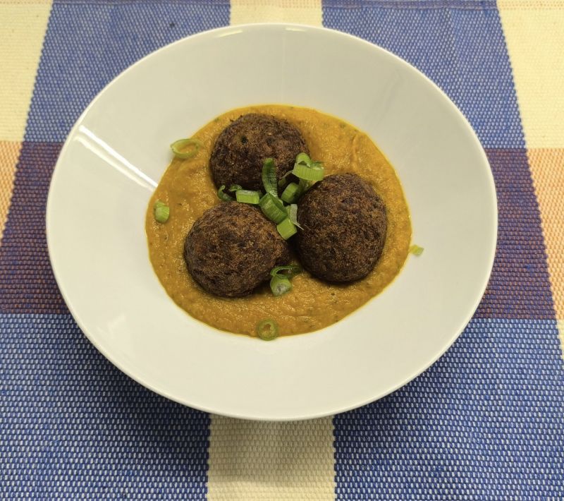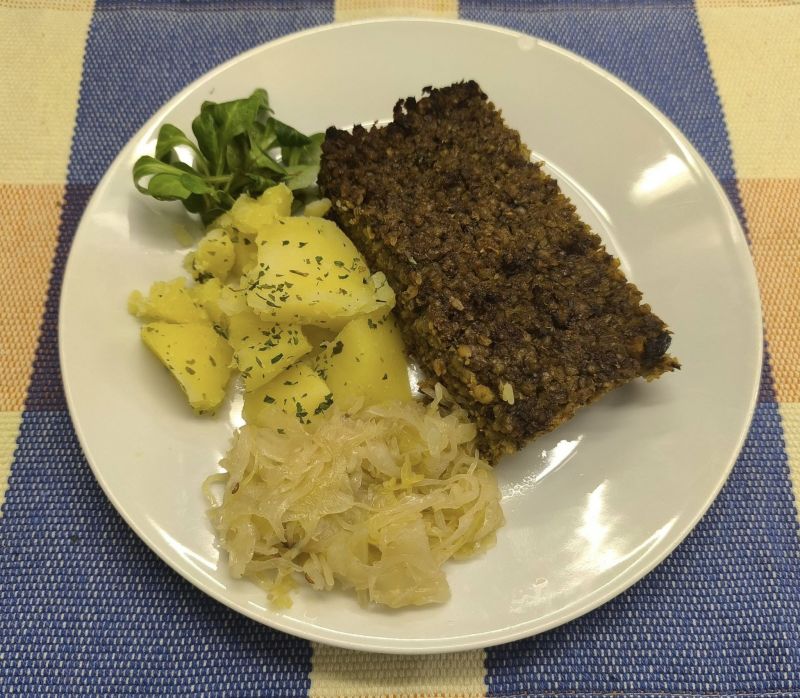 1. Myslivecký guláš s knedlíkem (V) (1) (Seitan dušený na červeném víně s jalovcem, paprikou, povidly a s knedlíkem)150 Kč