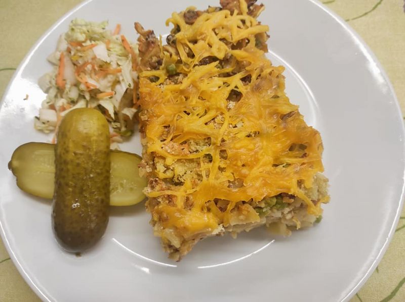 3. Tofufleky (V) (1, 6) (Zapečené těstoviny s uzeným tofu, hráškem a vegan sýrem, podávané s kyselým okurkem)150 Kč