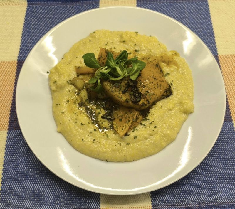 2. Hasselback al forno (B) (V) (Pečená brambora s červenou řepou na česneku s teplým beluga čočkovým salátem)150 Kč