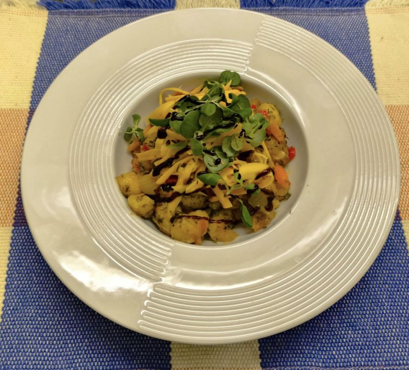 1. Maďarský tokáň s tarhoňou (V) (1, 6) (Dušené sójové kousky na leču, podávané s tarhoňou a strouhaným vegan sýrem)150 Kč