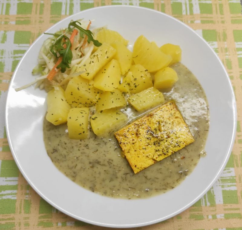 2. Koprová omáčka s brambory a pečeným tofu (B) (V) (6) (Koprová omáčka s vegan smetanou, vařenými brambory, pečeným tofu)150 Kč