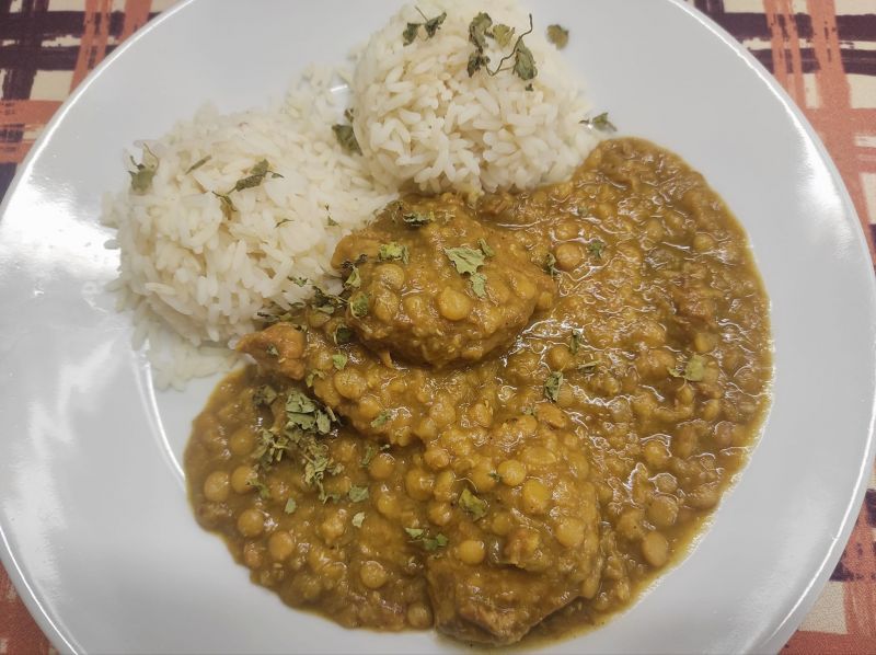 2. Mauricijský haleem s rýží (B) (V) (6) (Sójové kousky podušené s čočkou, a mauricijským kořením, podávané s rýží)150 Kč