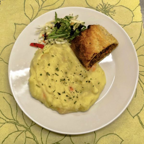 3. Tofufleky (V) (1, 6) (Zapečené těstoviny s uzeným tofu, hráškem a vegan sýrem, podávané s kyselým okurkem)150 Kč