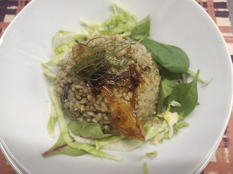 3. Houbové risotto (B) (V) (Dušená rýže na bílém víně s žampiony, mrkví, tymiánem, sypané vegan sýrem)150 Kč