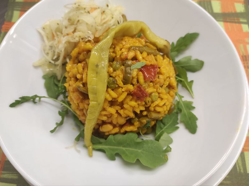 2. Paella valenciana (B) (V) (Dušená rýže na víně s fazolkami, rajčaty, česnekem, citronem a olivami)150 Kč