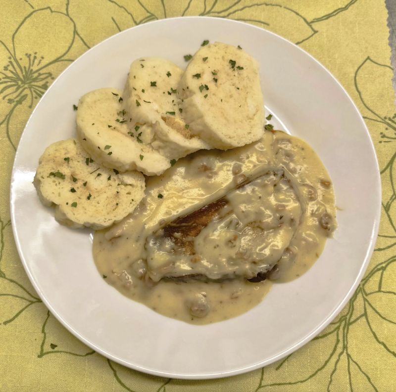 1. Seitanový plátek s liškovou omáčkou a knedlíkem (V) (1, 6) (Seitanový plátek ve vegan smetanové omáčce s houbami liškami, podávaný s knedlíkem)150 Kč