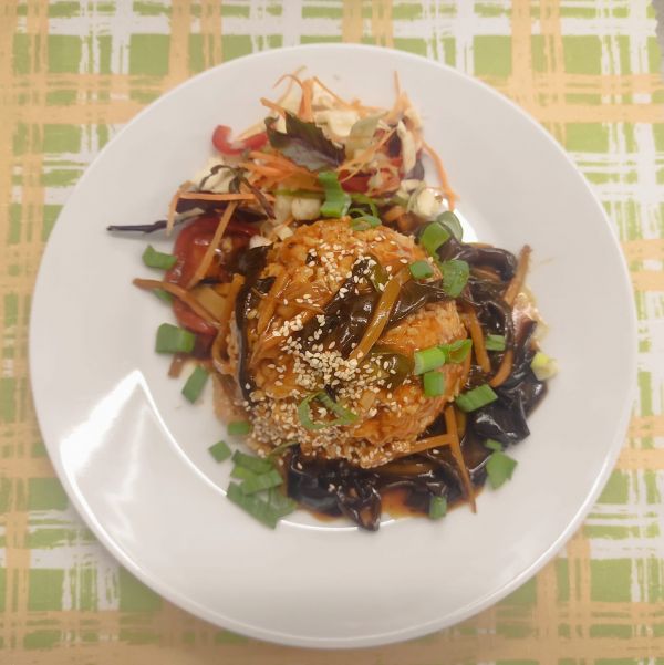 2. Thajská kokosová rýže s jidášovým uchem a bambusem (B) (V) (Rýže dušená s kokosovým mlékem s jidášovým uchem, bambusovými výhonky a cibulkou)150 Kč