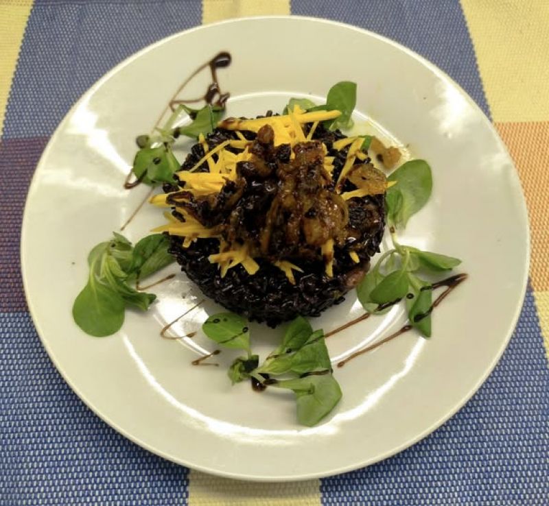 2. Srbské černé risotto (B) (V) (6) (Dušená černá rýže na bílém víně s hlívou, tofu a karamelizovanou cibulkou)150 Kč