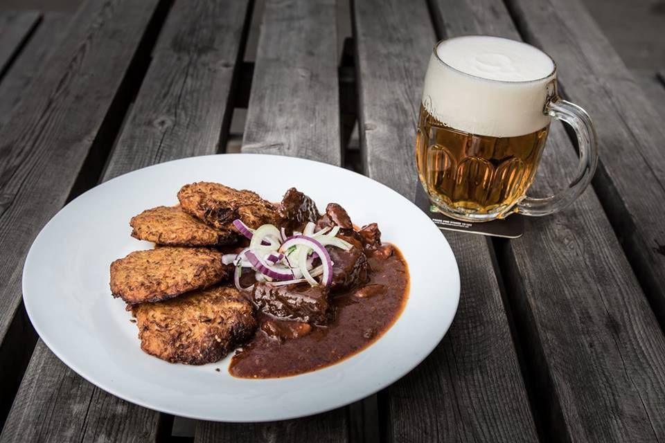 2. vepřové výpečky/ kostky plece pečené na kmínu a česneku, restované červené zelí, šťáva z výpeku, bramborové knedlíky165 Kč
