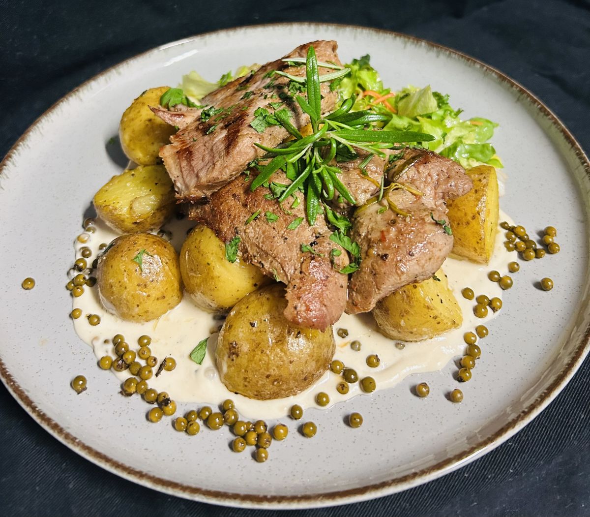 - (200g masa se smeranovo-pepřovou omáčkou, restované brambory na másle, salát)