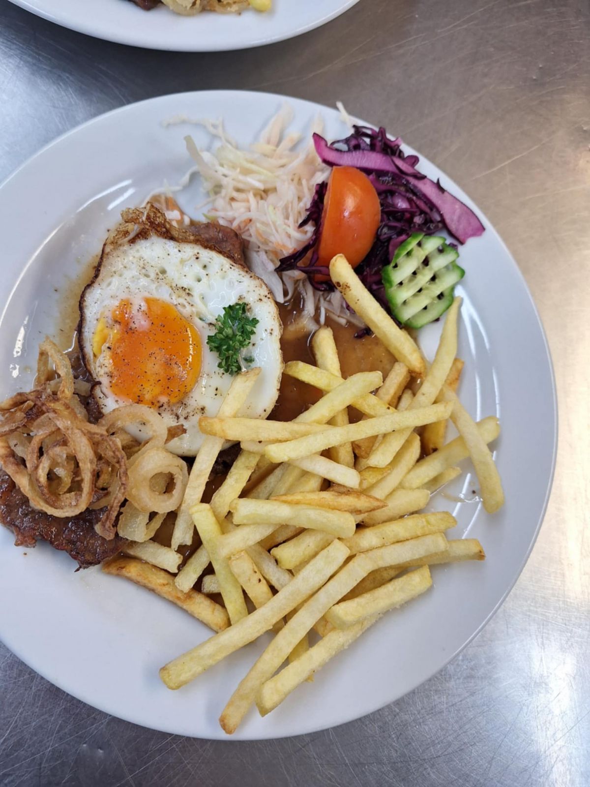 1. Vepřový plátek, sázené vejce, opečená anglická slanina, hranolky142 Kč