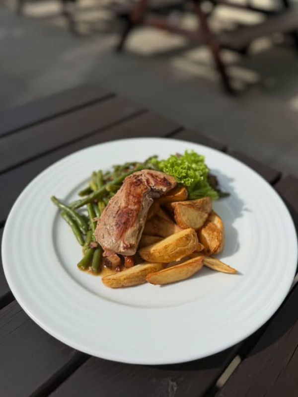 8. Špalík z vepřové panenky, fazolové lusky s česnekem a slaninou, americké brambory195 Kč