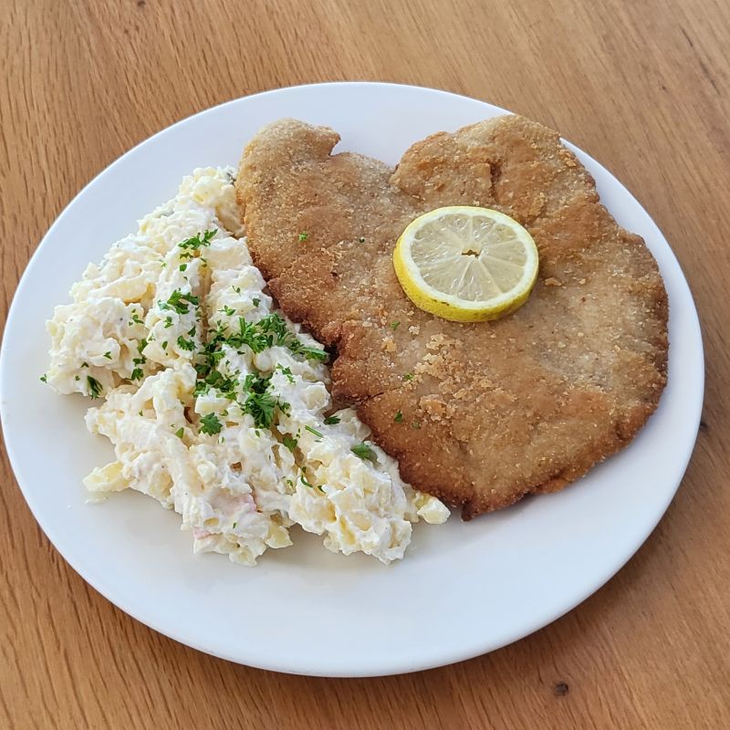 4. C). 150g Vepřový maxi řízek v trojobalu smažený na sádle, domácí bramborový salát s majonézou, citron145 Kč