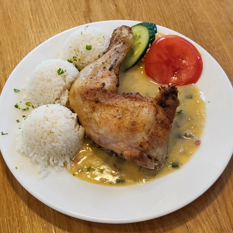 5. D). 150g Pečené kuřecí babiččino stehýnko (cibule, anglická slanina, pórek, smetana), šťouchané brambory / dušená rýže145 Kč