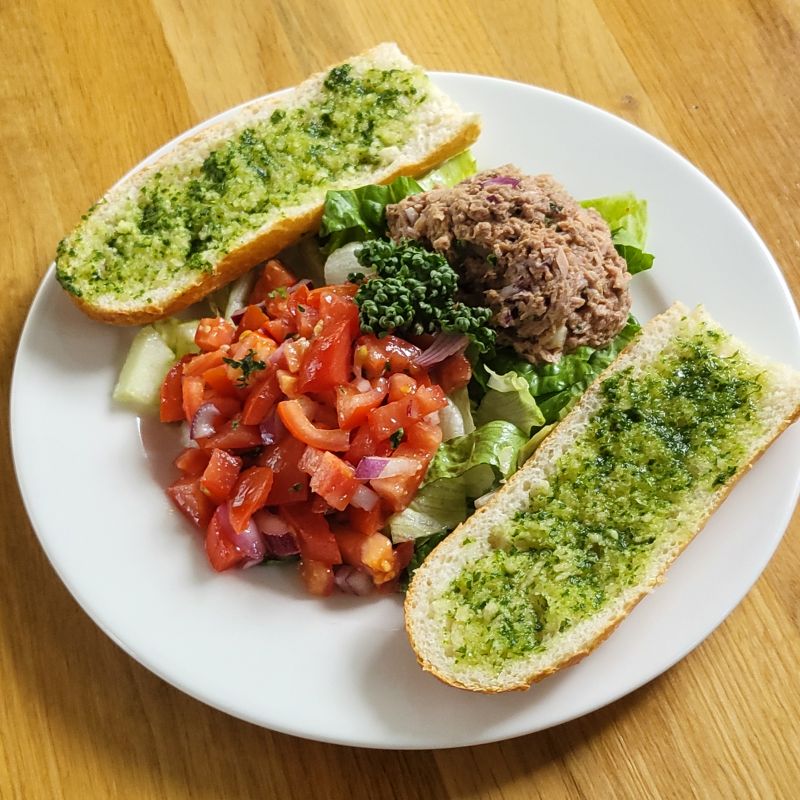 6. E). 350g Tuňákový tataráček s červenou cibulkou a hrubozrnnou hořčici na listích salátu, rajčatový salát s olivovým olejem a citronovou šťávou, opékaná bageta s rukolovým pestem139 Kč