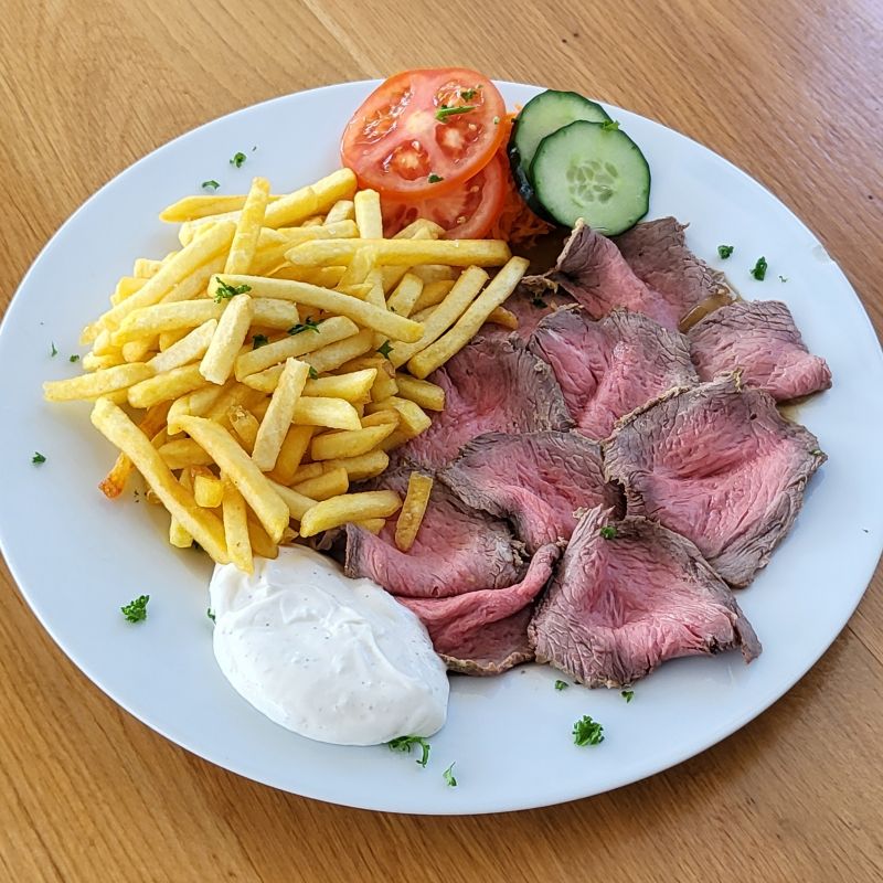 3. B). 150g Anglický rostbíf (hovězí roštěná naložená v hořčici a česneku, podávaná za studená), přírodní šťáva, hranolky, česneková majonéza159 Kč