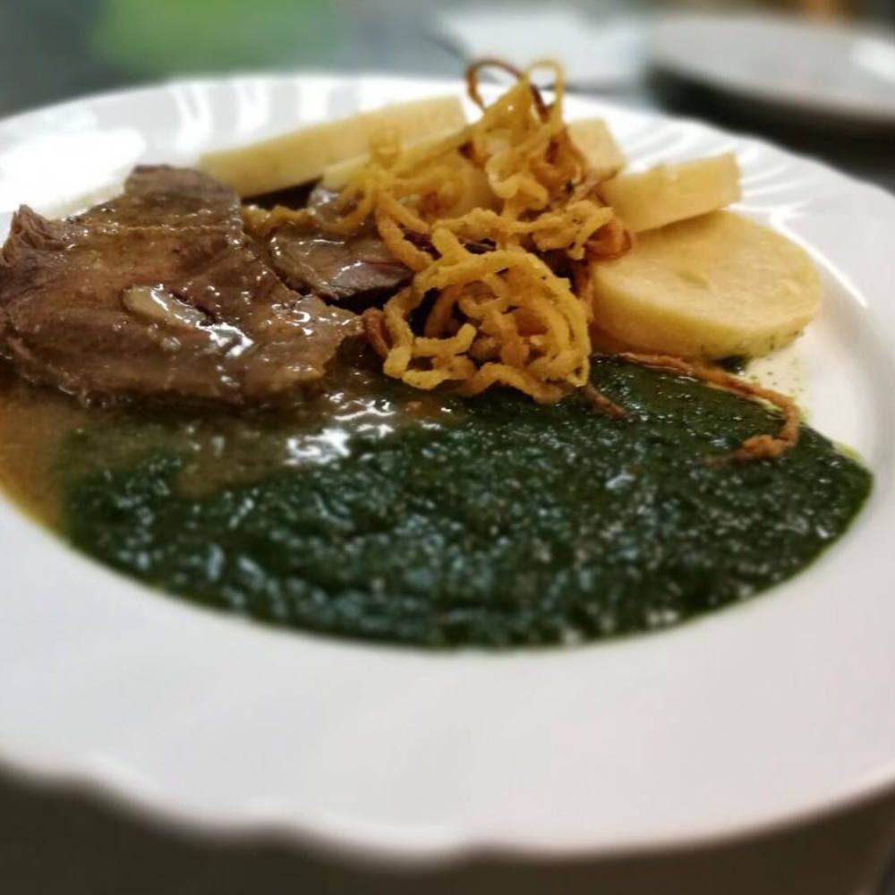 4. Pečená vepřová plec na rozmarýnu, bramborové knedlíky s restovanou cibulkou, dušený špenát165 Kč