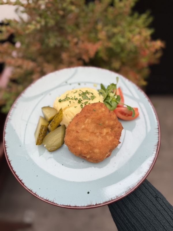 • 4. Holandský řízek se sýrem, podávaný s máslovou bramborovou kaší a kyselým okurkem (150 g)