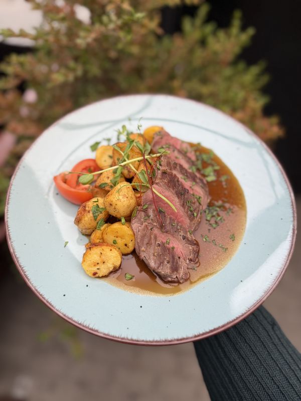 • 5. Sous-vide hovězí rump steak s omáčkou z portského vína a pečenými brambůrky grenaille (150 g)
