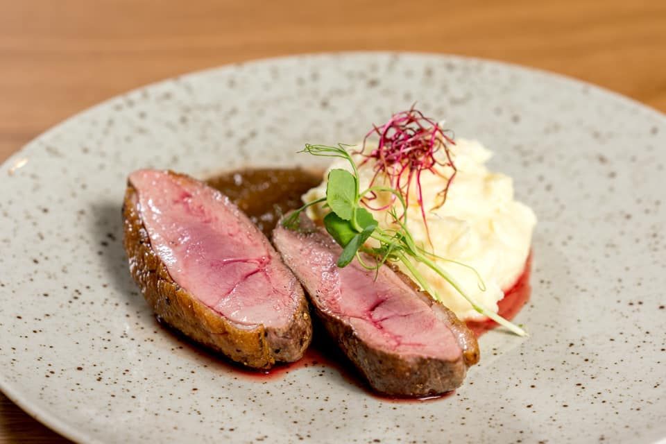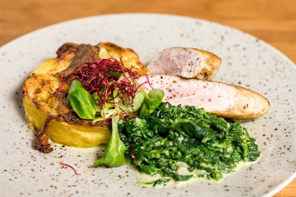 1. 150g Marinovaný vepřový steak, podávaný s gratinovanými brambory sýrem Cheddar a salátem coleslaw