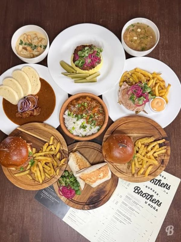 • 6. Malý Mushroom burger + hranolky – 80g hovězího mletého masa, opečená slanina, Irish red cheddar, žampiony a dresink z pečeného česneku na polníčku, hranolky