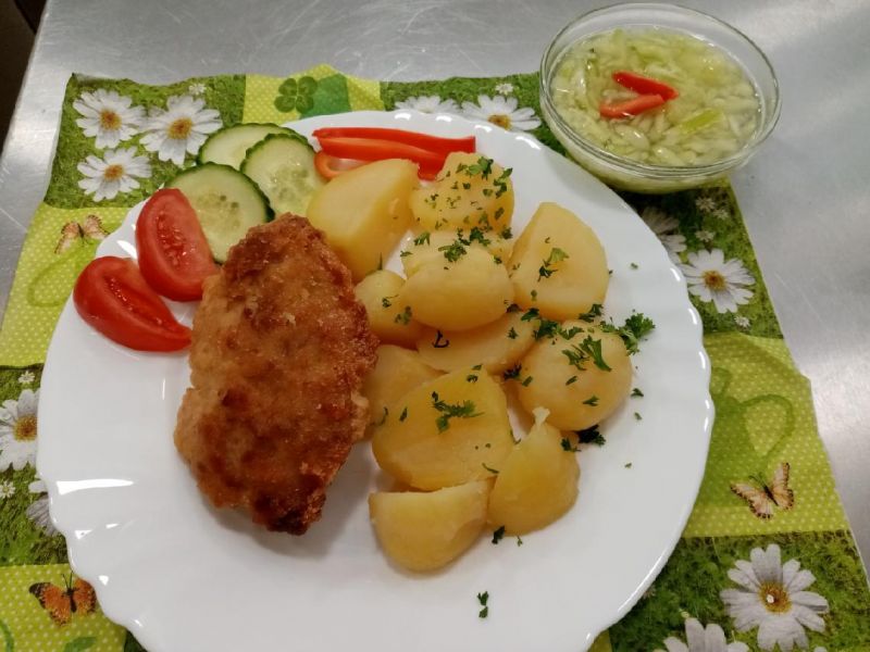 3. 120g smažený karbanátek, vařené brambory, salát 137135 Kč