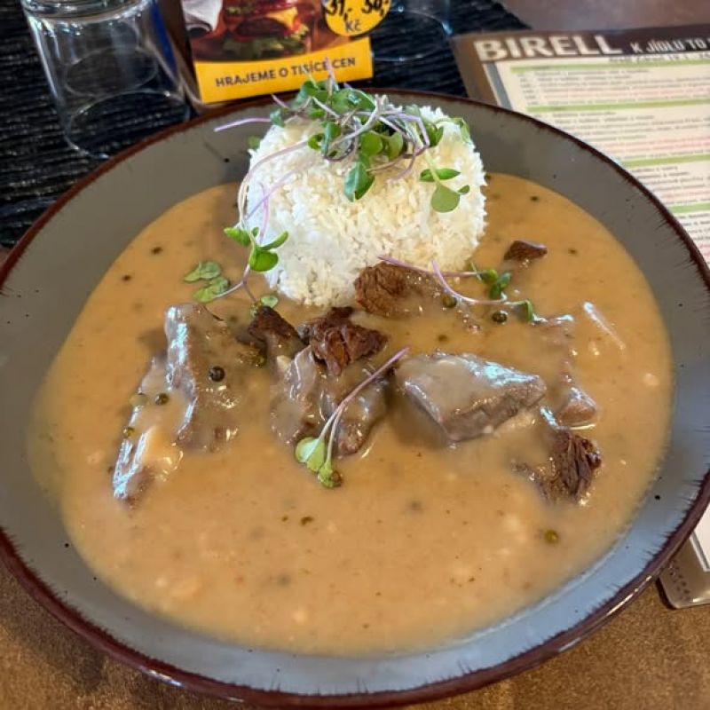 1. Hovězí guláš na černém pivu s cibulkou, houskový knedlík159 Kč