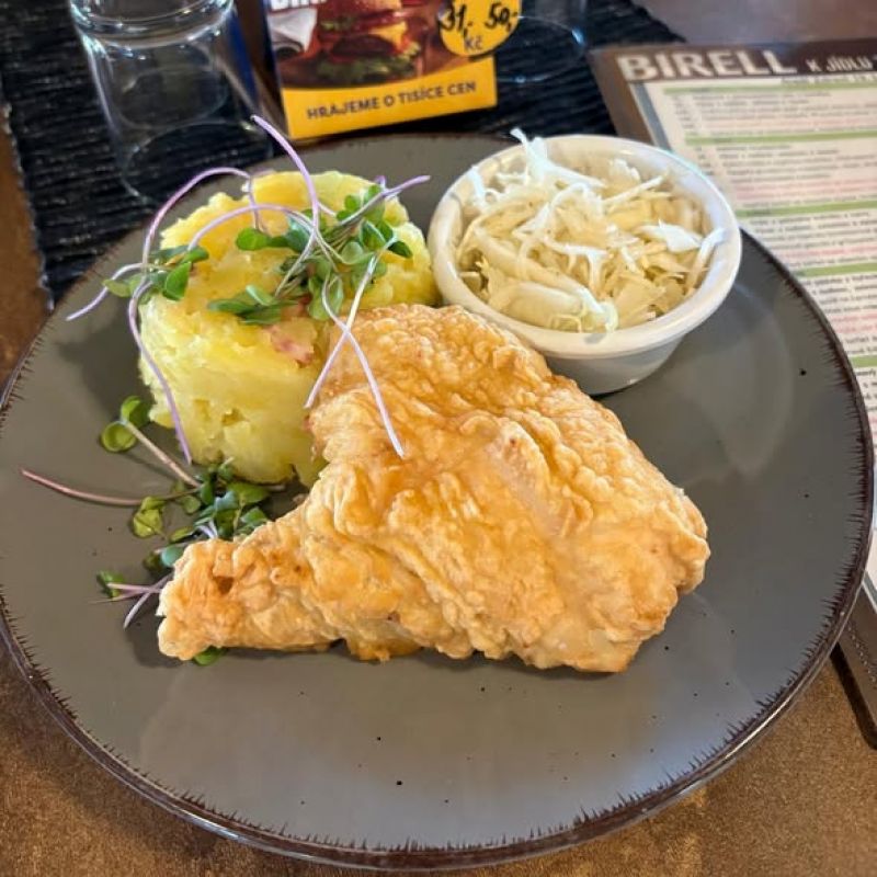 2. Smažený kuřecí kyjevský řízek plněný bylinkovým máslem, bramborová kaše, salát z červené řepy149 Kč