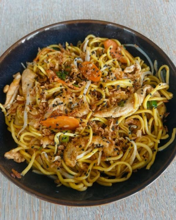 1. Teriyaki Udon nudle s kuřecím masem, červenou cibulkou, červenou paprikou, pórkem, jarní cibulkou a sezamem 134611175 Kč