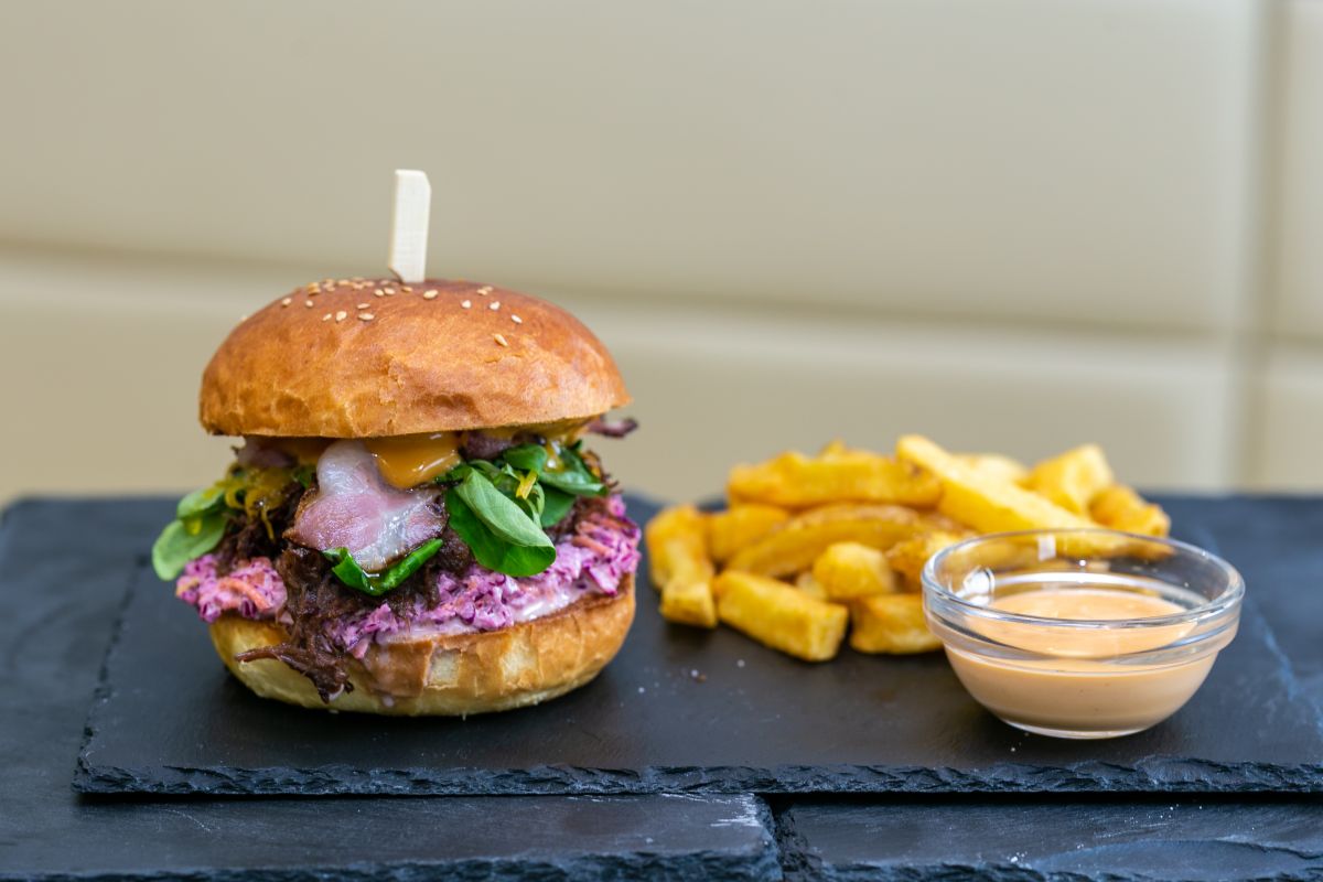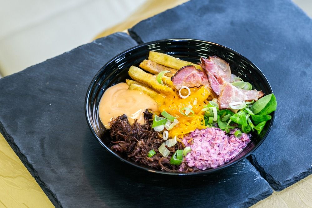 1. Mini tortilly s kuřecím gyrosem, koprovým dipem, salátovou okurkou, cherry rajčaty, balkánským sýrem, mixem salátů a hranolky 37175 Kč