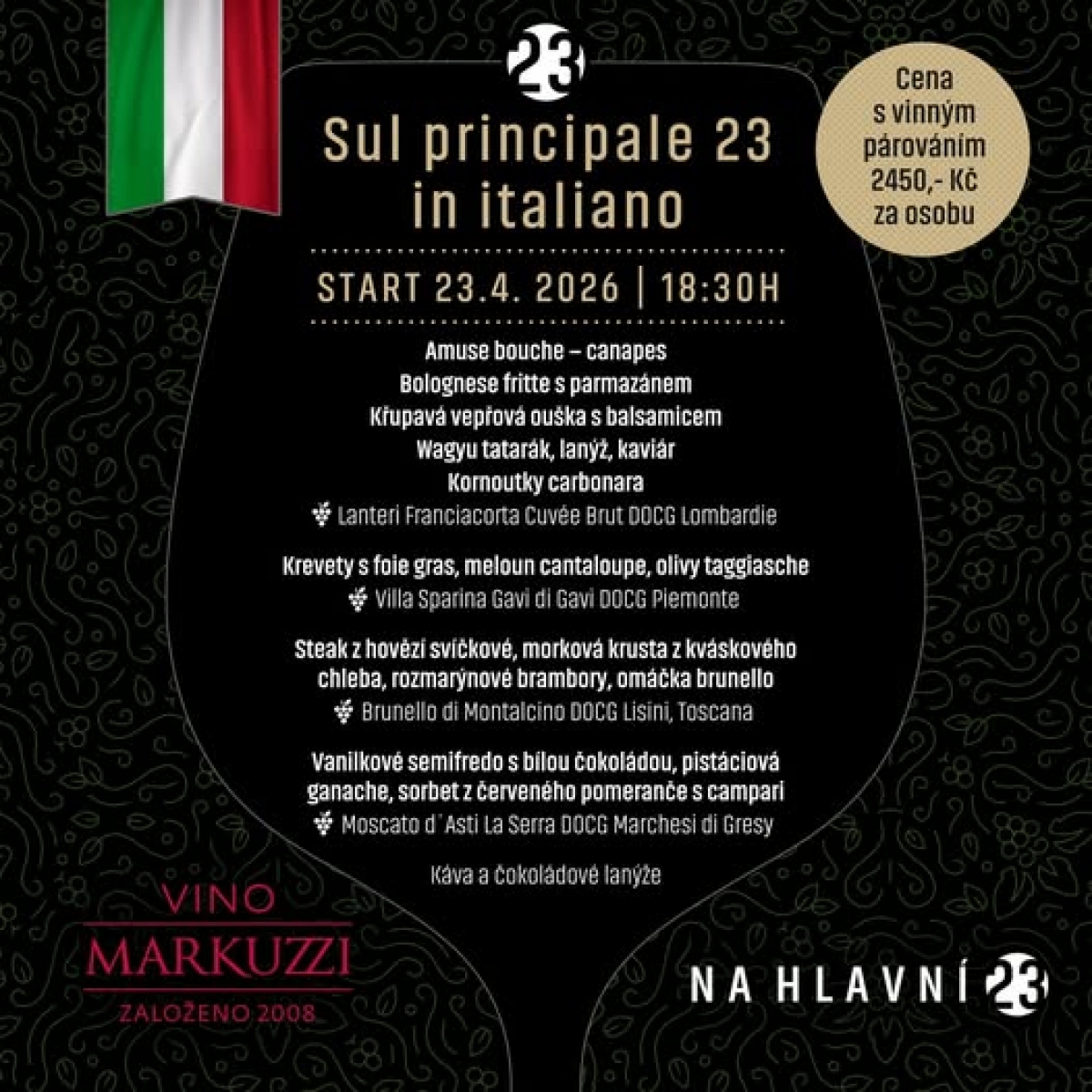 Skvělá akce pro milovníky horké Itálie je za dveřmi 🇮🇹 spojili jsme síly s Vino Markuzzi a připravili jsme pro Vás degustační večer plný skvělého jídla, pití, atmosféry a povídání o víně. Degustací Vás provede sám pan Jiří Markuzzi a o skvělý gurmánský zážitek se postará šéfkuchař Tomáš Sysel se svým týmem❤️🔥