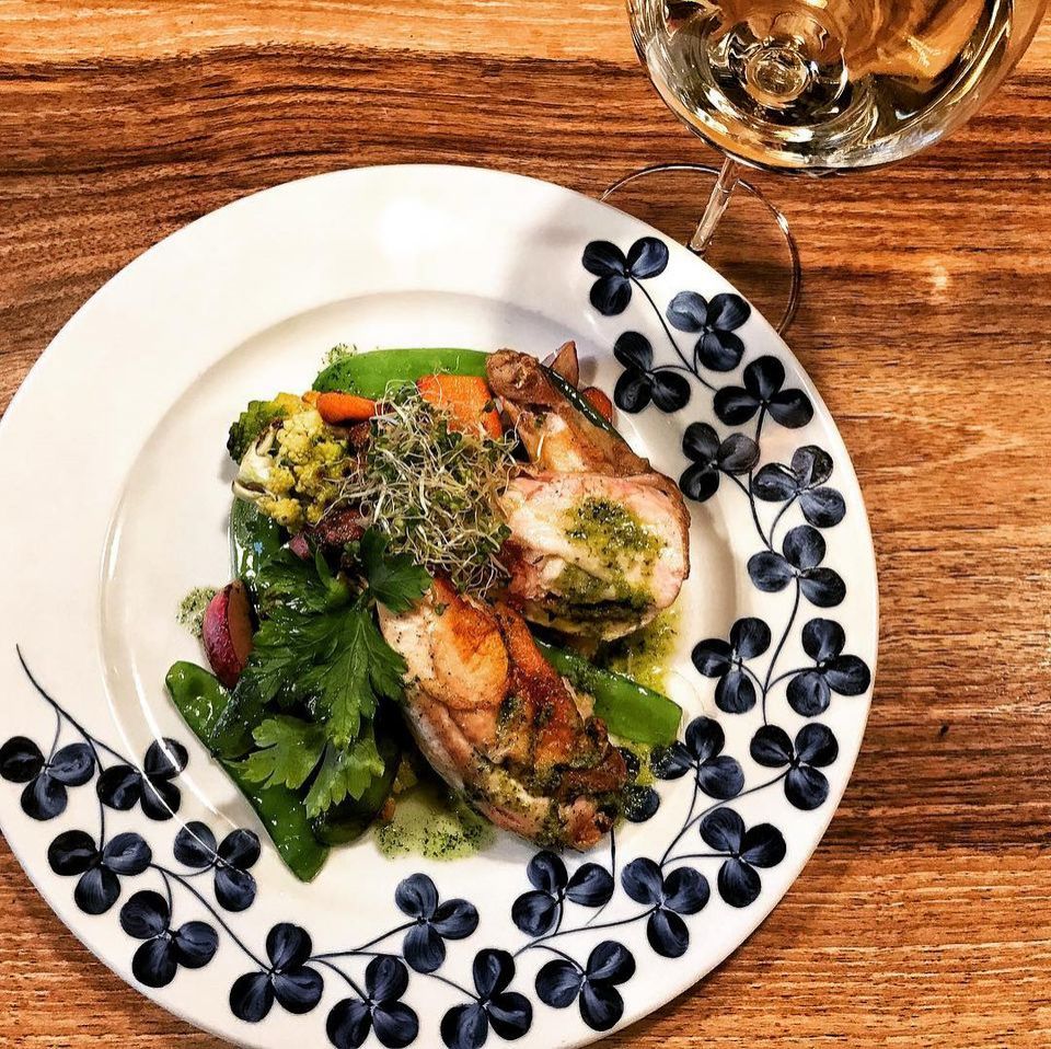- Kuřecí supreme (sous vide) zapečená bramborová kaše, zelenina restovaná na javorovém sirupu a koňaku, demi glace s česnekem a tymiánem385 Kč