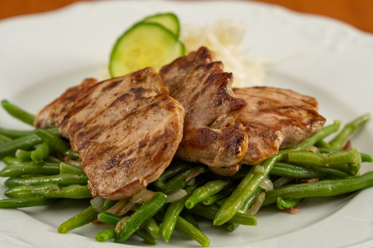 1. 150 g Míchaný salát s rajčaty, červenou řepou, mozzarellou a grilovanou vepřovou panenkou, bazalkové pesto, opečená houstička189 Kč