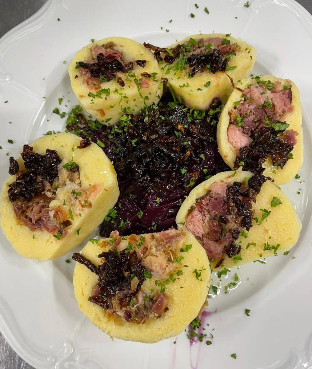 4. 200 g Bramborové noky se smetanovou omáčkou, kuřecím masem a houbami, strouhaný sýr179 Kč