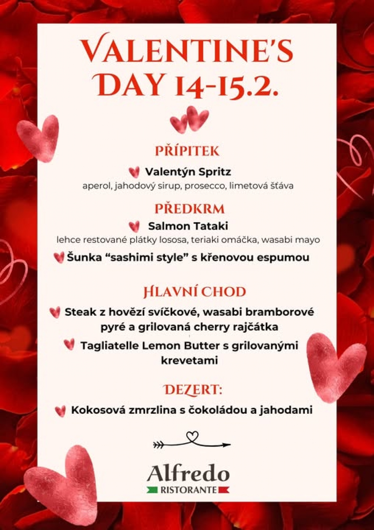 Naši milí zákazníci tímto vám představujeme naše Valentýnské menu.