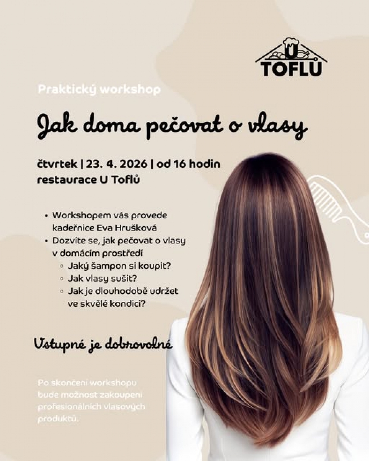 👉 V restauraci U Toflů se můžete těšit na skvělou kadeřnici Evu Hruškovou, která vás provede světem péče o vlasy. 🌸