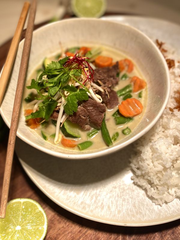 1. Pad Pong Kaorae - kuřecí maso v krémové curry omáčce se zeleninou, jasmínová rýže 17169 Kč