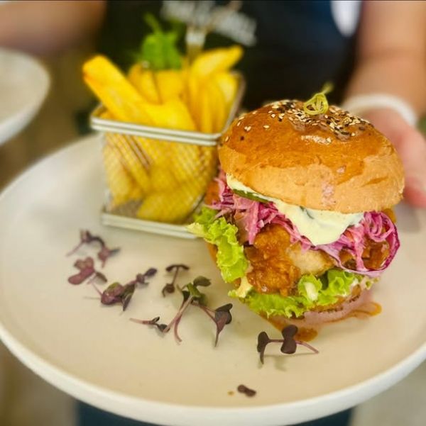 3. CHICKEN BURGER - burger s křupavým kuřetem, zeleninou, asijským salátem colesaw, hranolky, tatarka 136711209 Kč